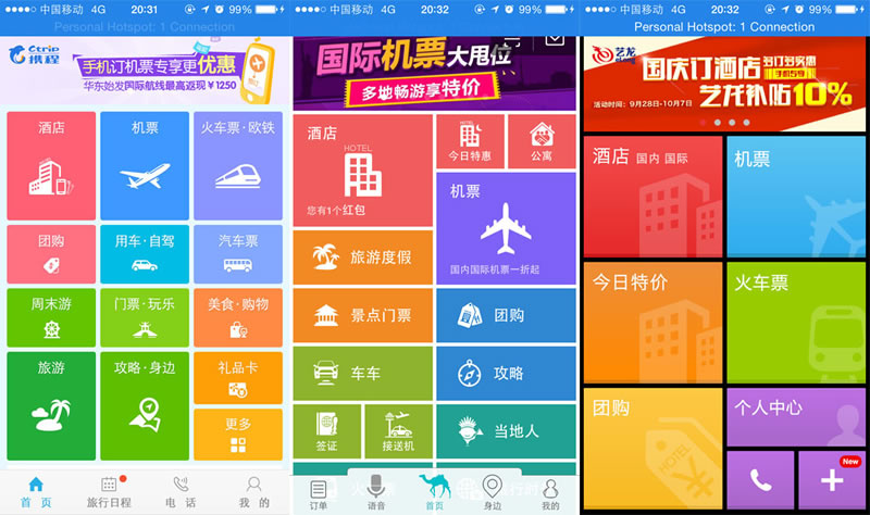 機票、酒店、旅游產品等全線促銷的攜程期待的是這樣一個場景。用戶從決定出行(不止是旅游)的那一刻就開始使用攜程的服務,從客戶端上預定酒店和交通,不論是飛機票、火車票還是汽車票。如果是打算出國,直接把簽證也一起搞定。有提前準備習慣的人可以從攻略身邊查看旅行攻略,了解目的地相關信息。在行程中,用戶能從美食購物了解到哪里好吃哪里好玩,預定包車,短線游等服務,也能根據自己行程的變化完成退訂和預定。精明的用戶或許還能在團購頻道找到特價的上述產品。
