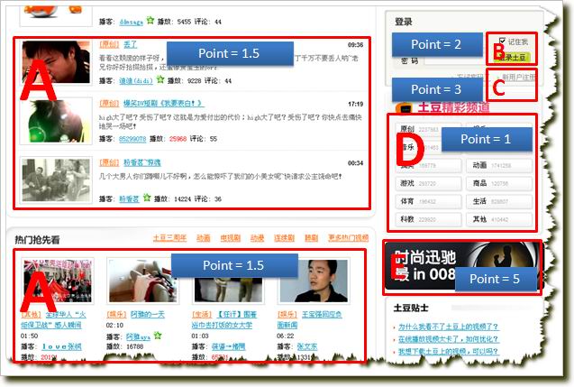 考慮這個頁面的不同交互,哪些是你認為重要的,哪些是次重要的,哪些是不重要的。在這個例子中,我們假設存在一個在線營銷活動,我們最希望用戶點 擊E區(qū),訪問“時尚迅馳”的活動頁面;其次,我們希望用戶盡量注冊我們的網站,也就是C區(qū),然后我們希望用戶登陸,即B區(qū);再次,我們希望用戶至少能夠訪 問頁面中的視頻,即A區(qū)。最后,最低限度,我們覺得用戶點擊訪問“精彩頻道”(D區(qū))也有點兒價值,只不過價值沒有前述行為那么大。這樣,我們就有了一個 圖景:用戶訪問的價值從大到小依次是:E>C>B>A>D。