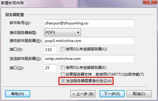 第三步:設置POP3或IMAP協議,勾選“發送服務器要求身份驗證”,下面以pop3協議設置為例: